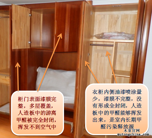 油漆家具內表面(內側),噴漆量少,也很少打磨。內表面看上去沒有外表面的光澤,摸上去略感粗糙,說明漆膜不完整,沒有起到全封閉作用,不能完全封閉人造板中的甲醛釋放,人造板中的游離甲醛從漆膜微細的破損處揮發出來,形成污染。
