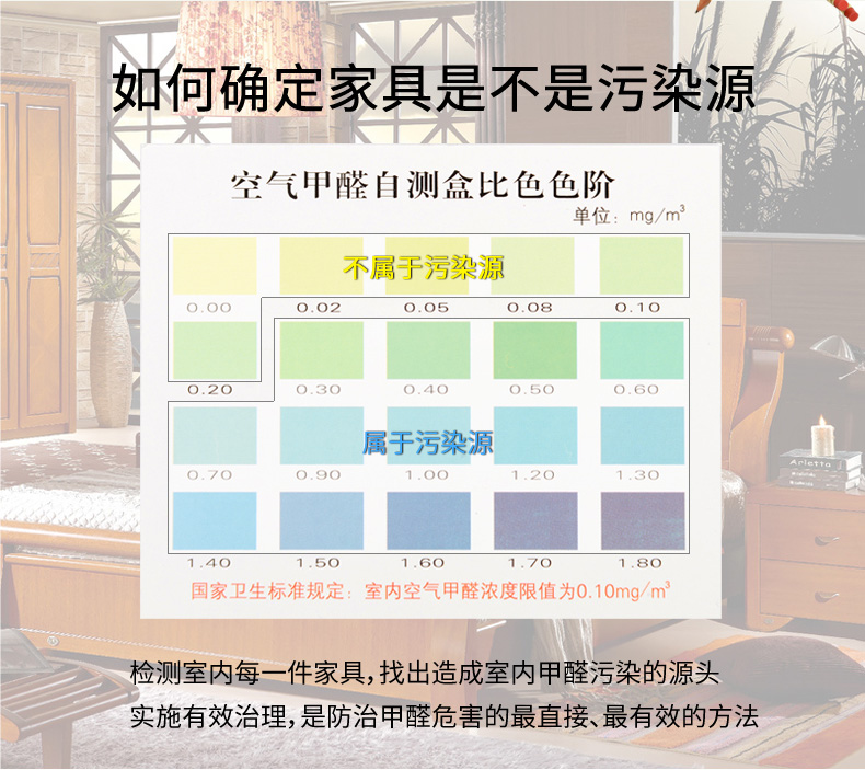 檢測盒顏色不一,甲醛濃度一目了然,對比色卡一眼明確甲醛釋放源。根據全國室內環境凈化治理指導中心副主任的經驗總結發現:家具物品內大于0.2的話就有可能造成室內甲醛超標了,所以檢測濃度高于0.2的就屬于甲醛污染源。