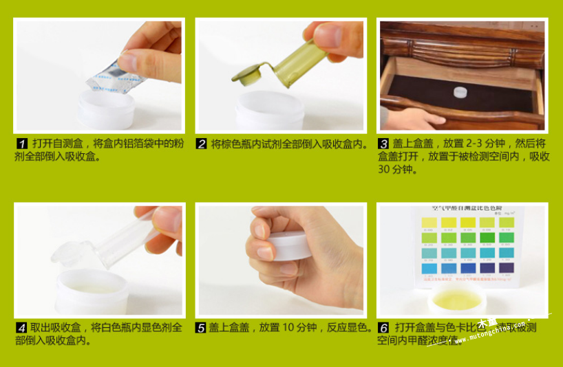 家具檢測:加入顯色劑后,蓋上蓋,放入家具中10分鐘,然后開蓋與比色卡對比。放置時間過短,試劑沒有充分反應,顏色不準確;放置時間過長,試劑變色,也會導致判斷失誤。