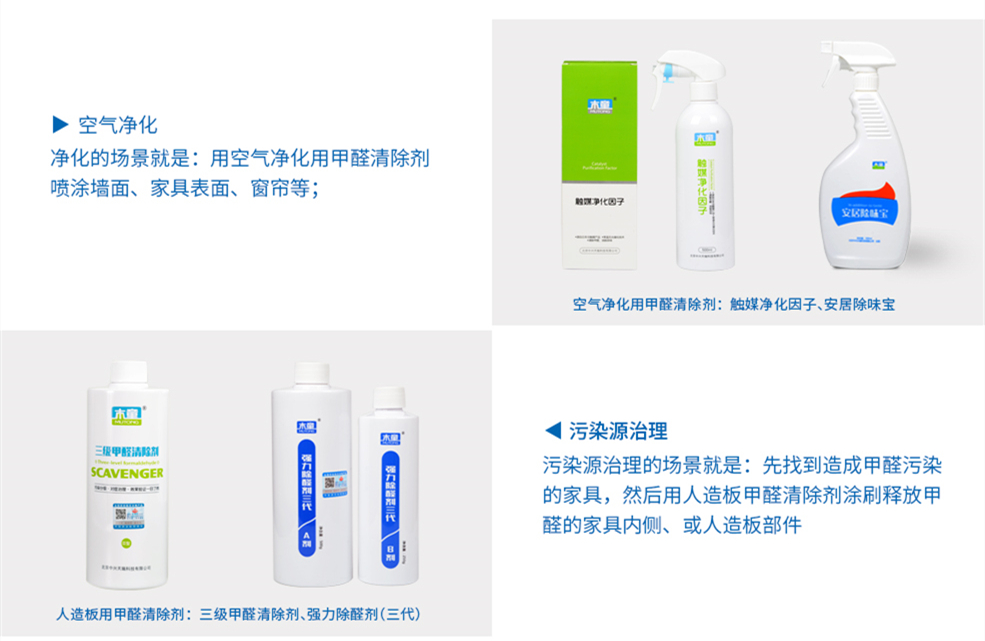 一種是木童三級(jí)甲醛清除劑,屬于人造板制品用甲醛清除劑,用途是治理經(jīng)過(guò)加工的人造板的甲醛釋放,如免漆板、三聚氰胺板、生態(tài)板等;以及用三聚氰胺板、生態(tài)板等免漆板制作的整體衣柜、榻榻米柜、櫥柜、儲(chǔ)物柜、書柜、電視柜等各種板式家具的甲醛污染。