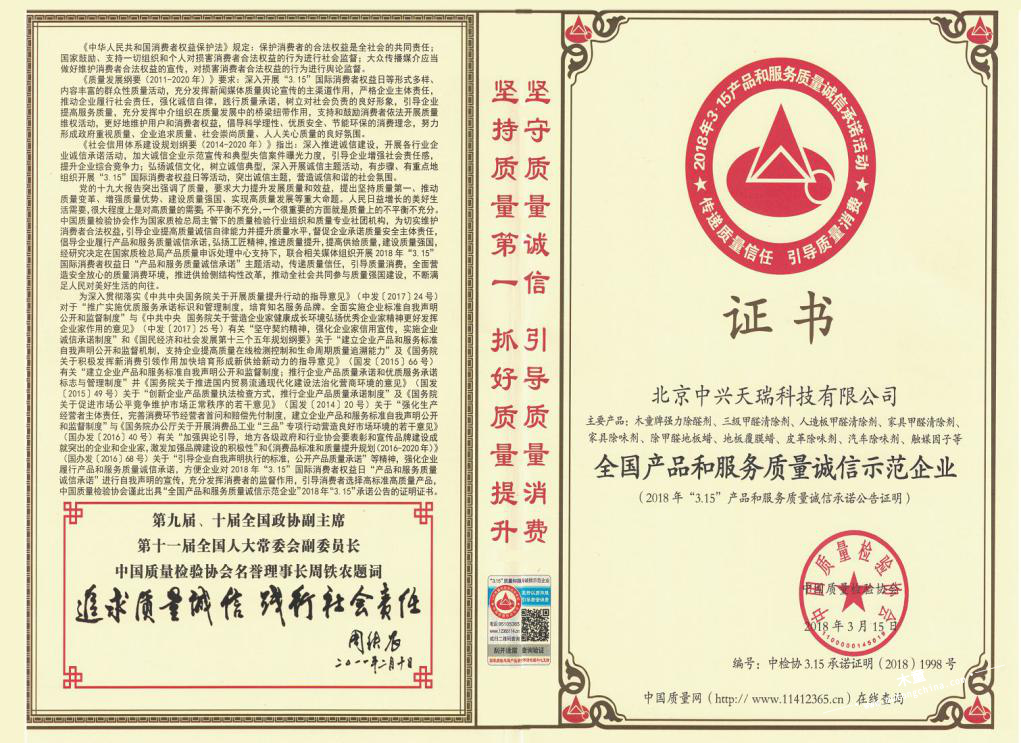 此次木童經(jīng)過(guò)國(guó)家質(zhì)檢總局和中國(guó)質(zhì)量檢驗(yàn)協(xié)會(huì)嚴(yán)格審查和層層篩選,最終榮獲“全國(guó)百佳質(zhì)量誠(chéng)信標(biāo)桿示范企業(yè)”、“全國(guó)產(chǎn)品和服務(wù)質(zhì)量誠(chéng)信示范企業(yè)”,兩項(xiàng)殊榮是對(duì)木童在產(chǎn)品技術(shù)、服務(wù)水準(zhǔn)等方面的高度認(rèn)可,也凸顯了木童在除甲醛行業(yè)里的領(lǐng)先地位。